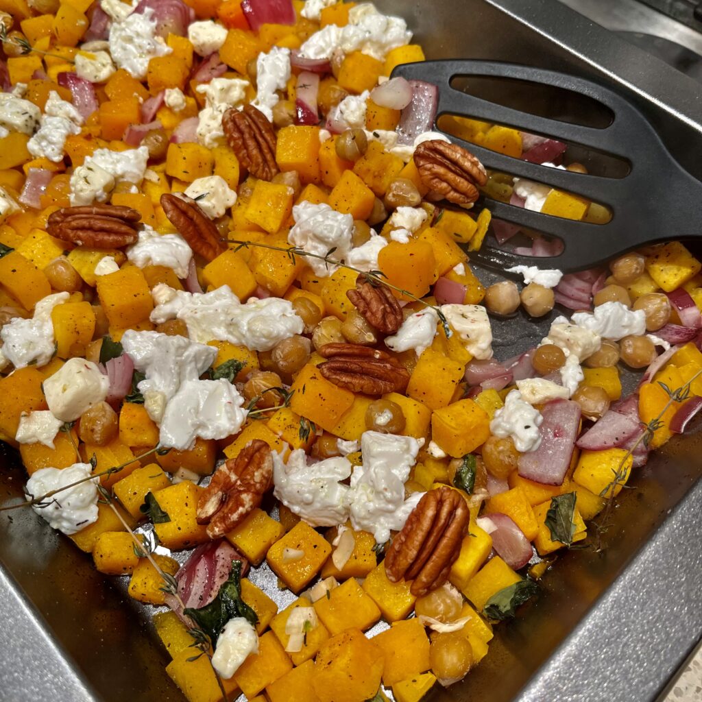 Dit is een heerlijk vegetarisch herfstgerecht, wat ook nog eens snel op tafel staat. Dus heel makkelijk voor door de week. Alle ingrediënten even snijden en de oven doet de rest. Voor het gemak heb ik voorgesneden pompoen blokjes gekocht. Uiteraard kun je zelf ook een (fles)pompoen in kleine stukjes snijden. Let wel op dat als je grote stukken snijdt de oventijd langer wordt.